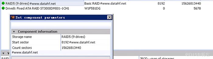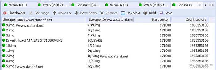 点击Build进行重组。组好后,由于数据从1024*8=8192个扇区开始,若专业恢复工具没有跳转到此扇区的功能,那么刚组好的RAID必须和一个文件再进行一次Build重组操作。RAID的起始扇区(Start sectors)选择8192,这个文件可以任意选择起始扇区和大小大小(Count sectors),下图为重组后的raid5磁盘阵列。