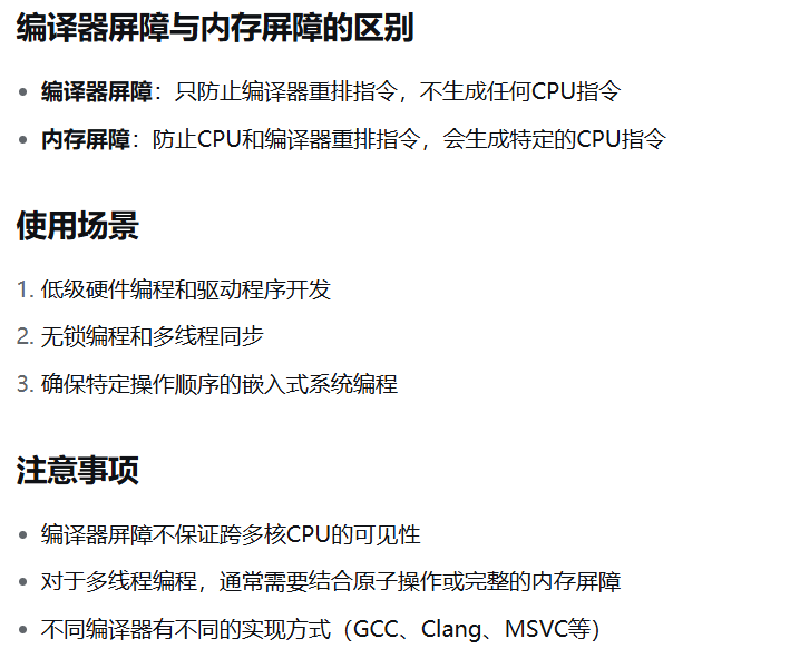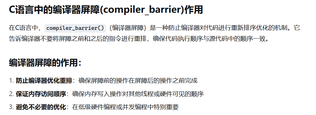 在需要确保操作顺序但不需要完整内存屏障的情况下,编译器屏障提供了轻量级的解决方案。