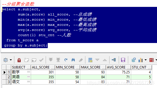 聚合函数主要有求和:sum();最大数:max();最小数:min();平均值:avg();统计数:count()等,在应用此类函数的时候,要么是从全集合来看或者从分组来看的。分组就是我们之前所说的维度,比如在成绩表中,我们需要按科目求出总成绩,最低成绩,最高成绩,平均成绩,以及人数。