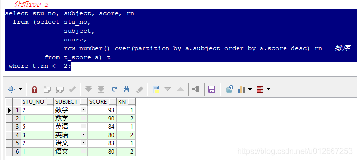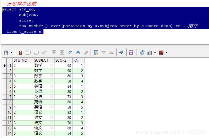 row_number() over ( partition by a.subject order by a.score desc ) rn -- 排序