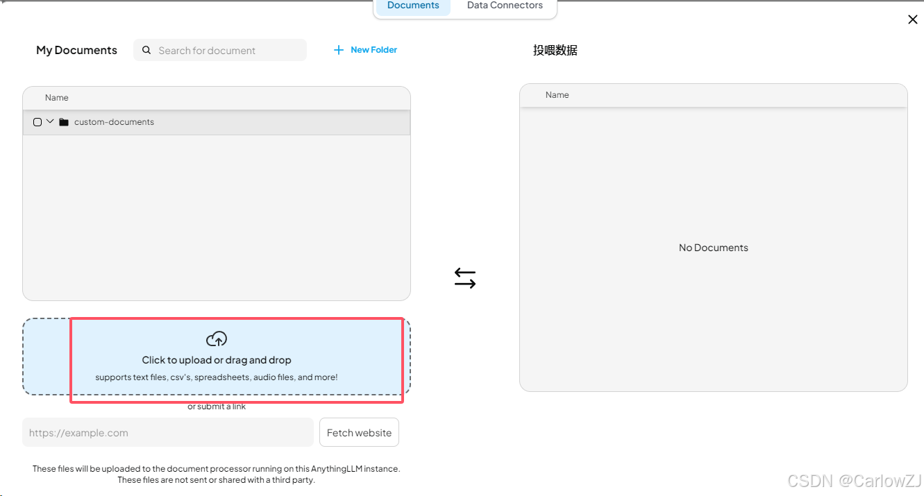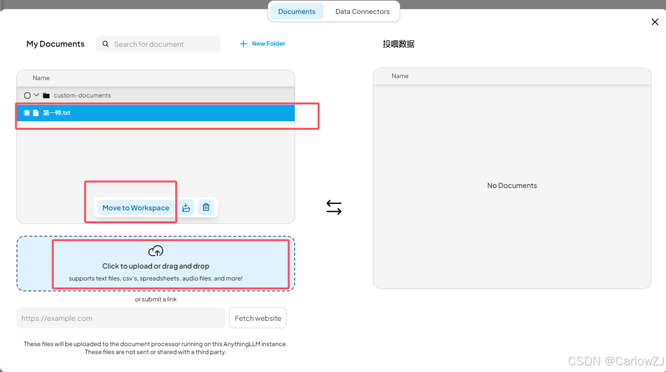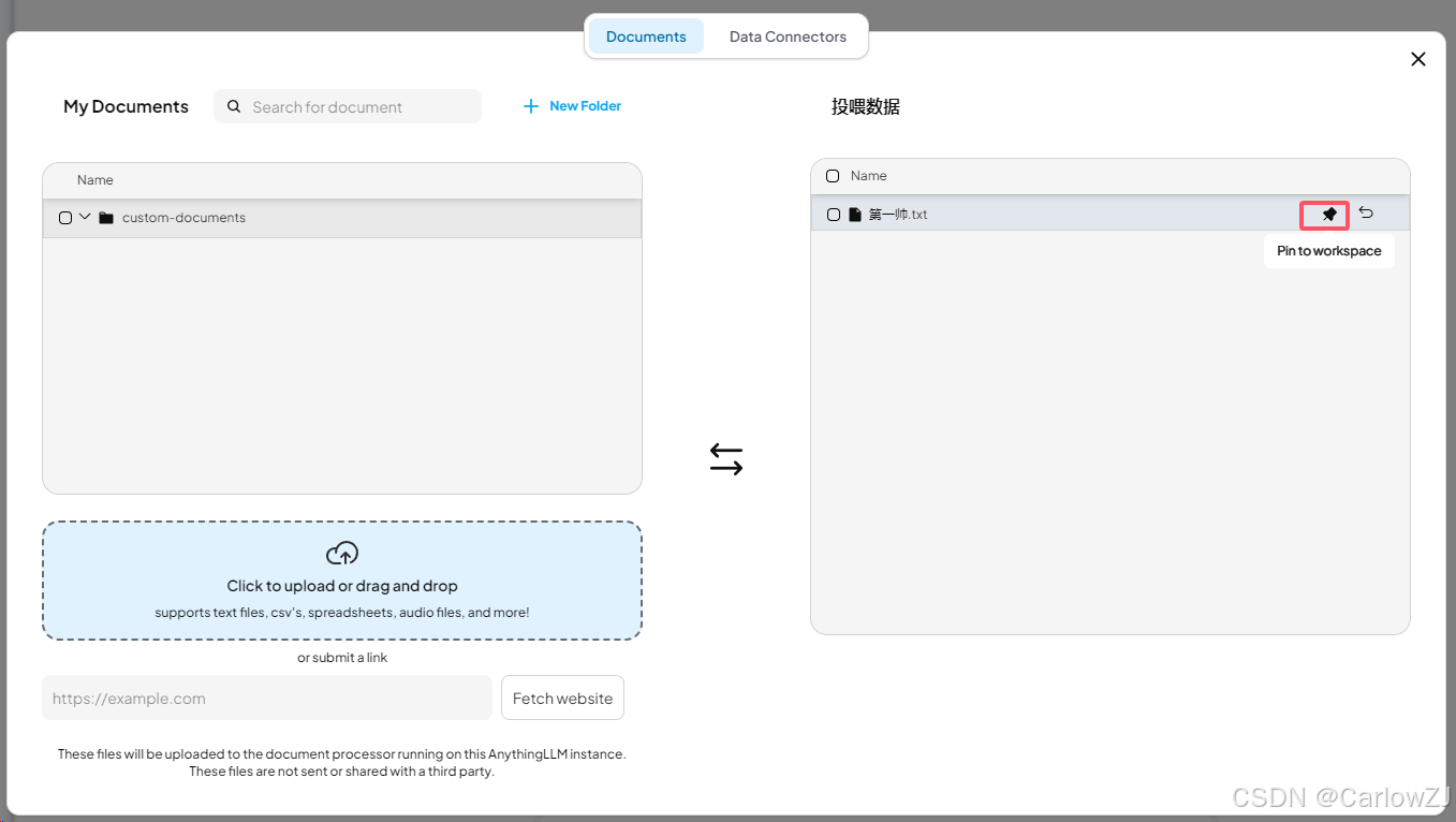 在 AnythingLLM 的工作区页面,点击“上传文档”按钮,选择需要训练的文档(支持 PDF、TXT、DOCX 等格式)。