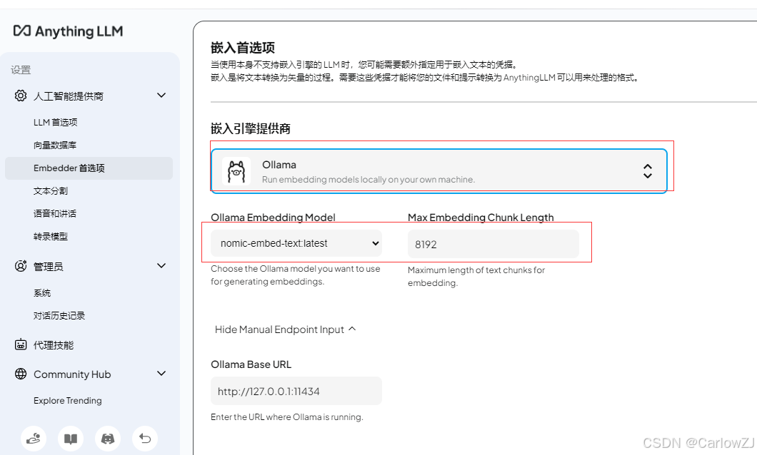 在“Embedding Preference”选项卡中,选择“Ollama”作为嵌入引擎提供商。