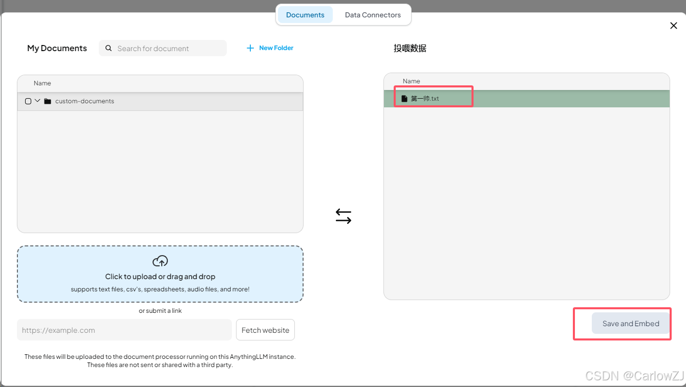 选中上传的文档后,点击“Save and Embed”按钮,等待模型完成向量转换。