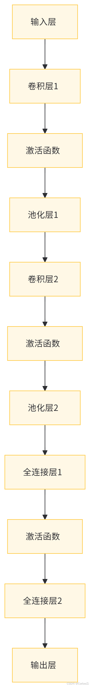 输入数据通过卷积层、激活函数、池化层和全连接层,最终得到输出结果。