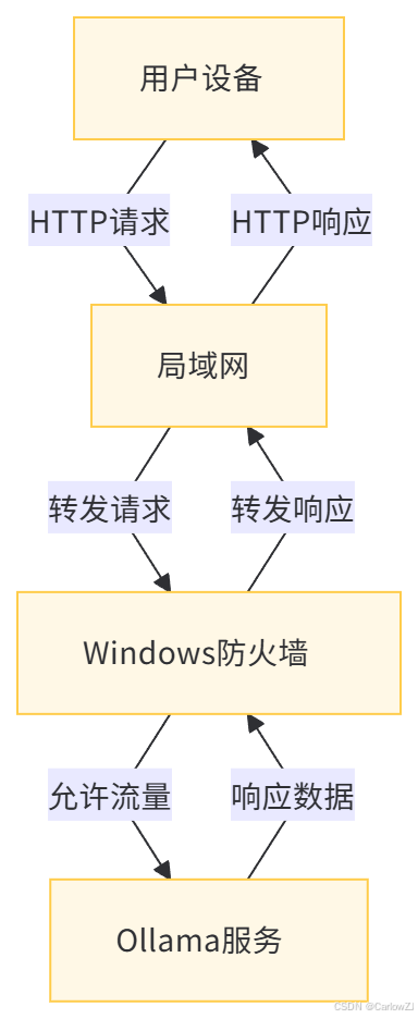 以下是使用Mermaid格式绘制的Ollama服务局域网访问的数据流图: