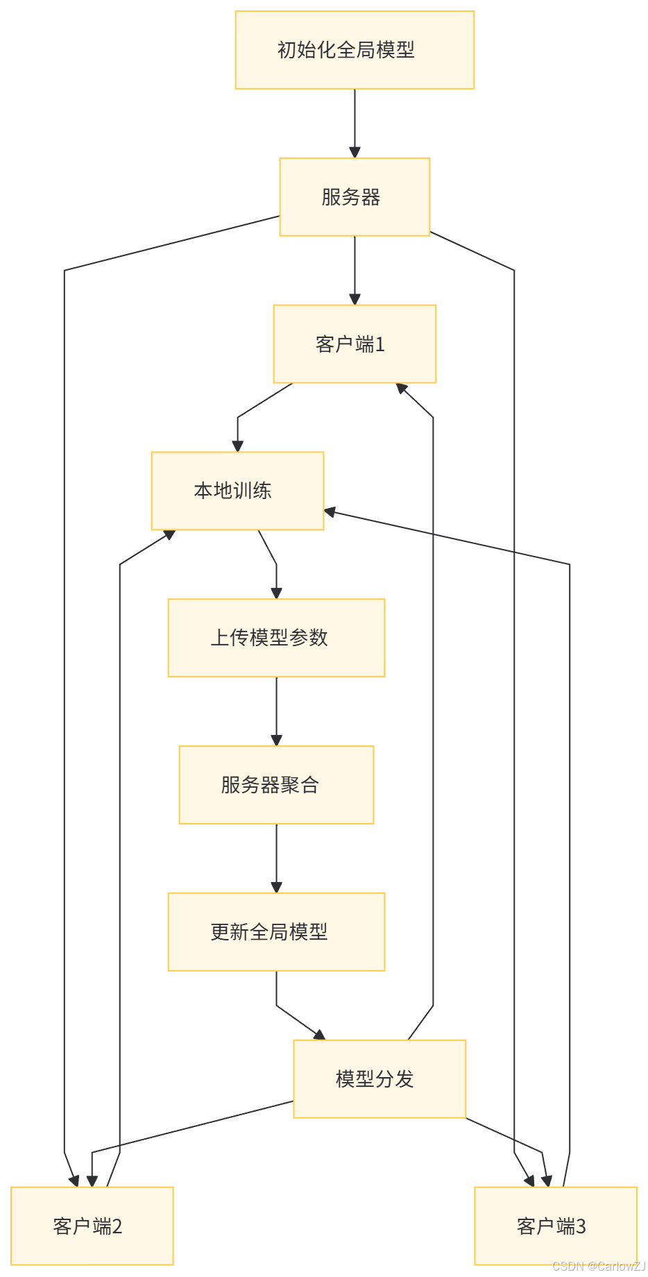模型分发:更新后的全局模型再次分发给客户端,重复上述过程,直至模型收敛。