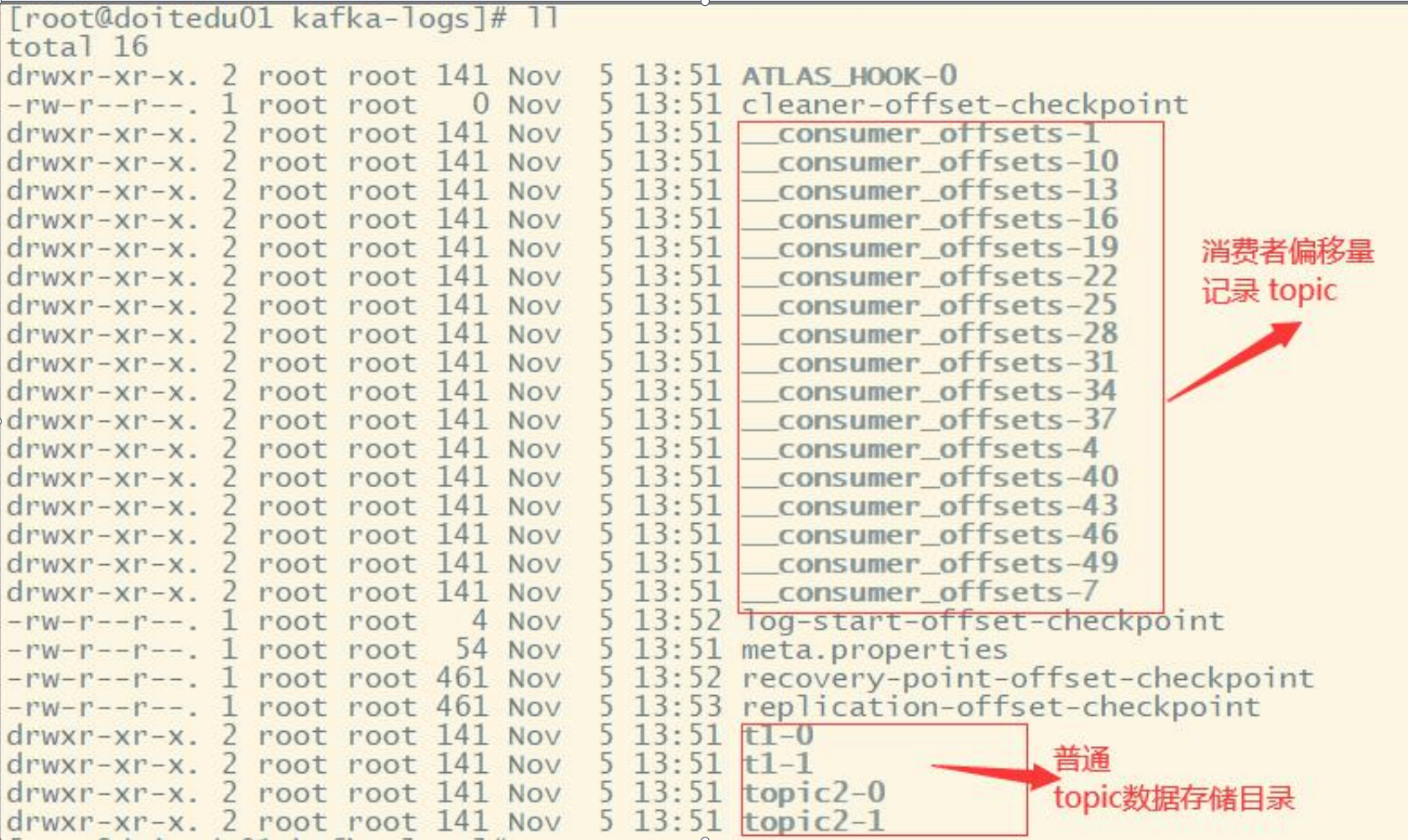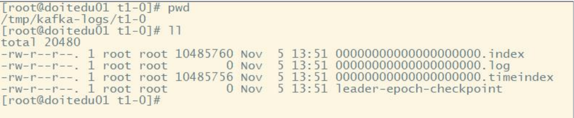 上图中 t1 即为一个topic的名称,而“t1-0/t1-1”则表明这个目录是 t1 这个topic的哪个partition。