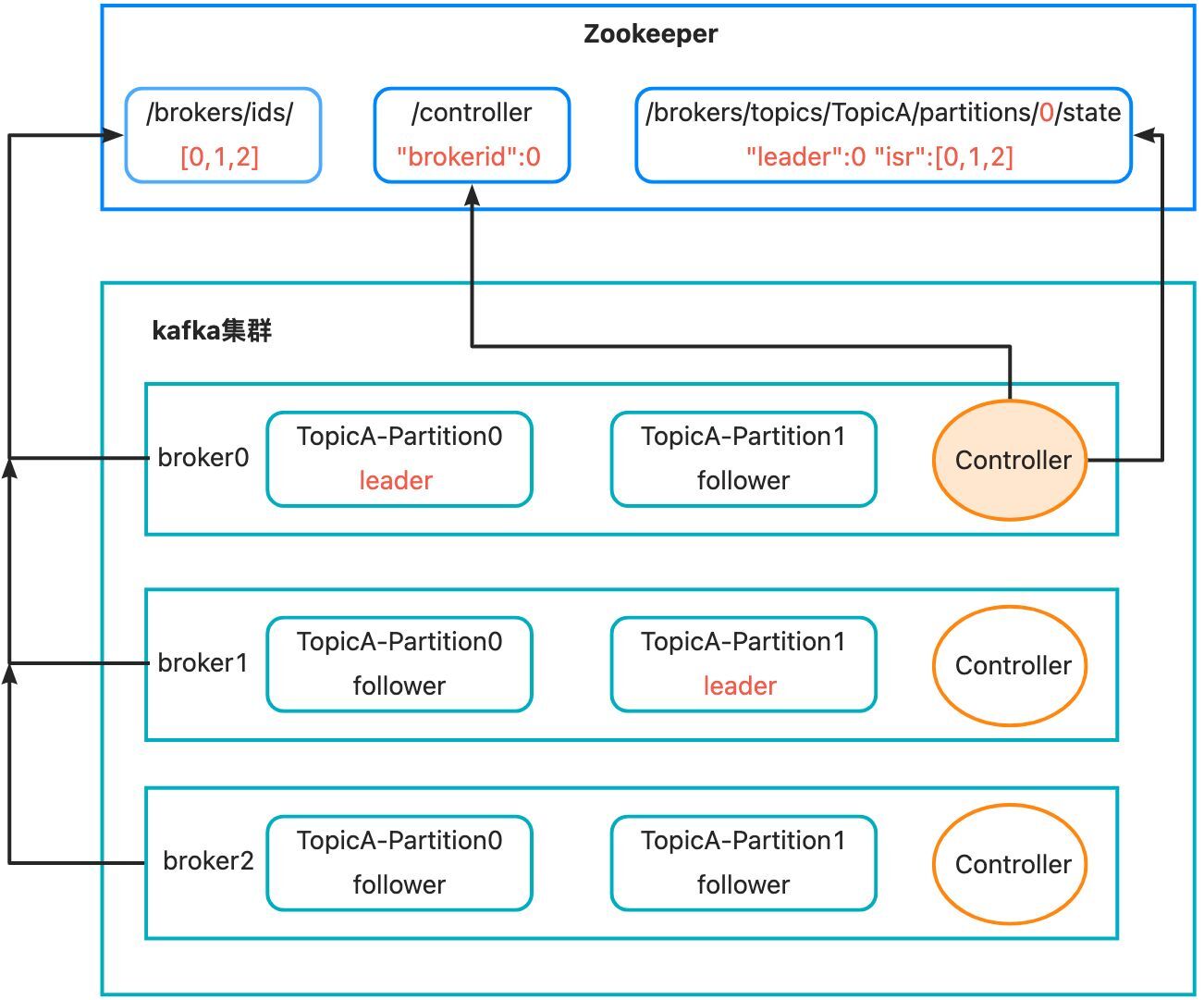 Kafka Controller会进行Leader选择,比如上图中针对TopicA中的 0 号分区,选择broker0作为Leader, 然后会将选择的节点信息注册到zookeeper的/brokers/topics路径下,记录谁是Leader,有哪些服务器可用。 -