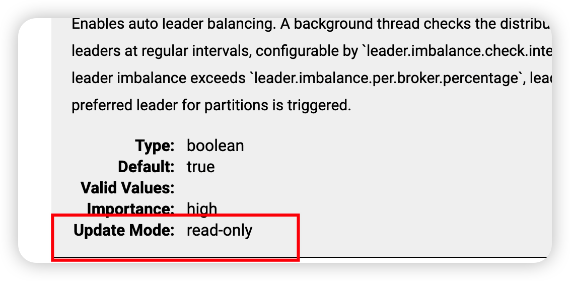 read-only。被标记为read-only的参数和原来的参数行为一样,只有重启Broker,才能令修改生效。 -