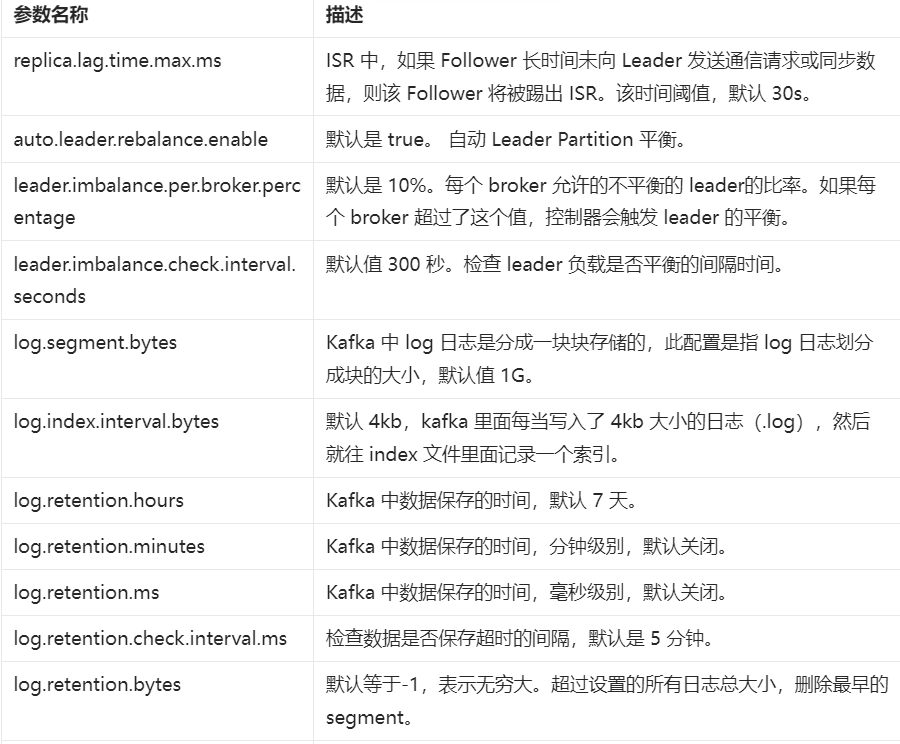 leader.imbalance.check.interval.seconds:默认值300秒。检查leader负载是否平衡的间隔时间。