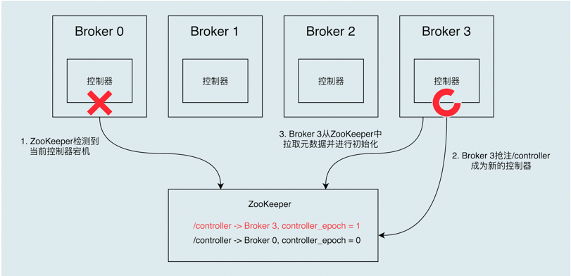 开始的时候,Broker 0 是控制器。当 Broker 0 宕机后,ZooKeeper 通过 Watch 机制感知到并删除了 /controller 临时节点。之后,所有存活的 Broker 开始竞选新的控制器身份。Broker 3最终赢得了选举,成功地在 ZooKeeper 上重建了 /controller 节点。之后,Broker 3 会从 ZooKeeper 中读取集群元数据信息,并初始化到自己的缓存中,后面就有Broker 3来接管选择Leader的功能了。