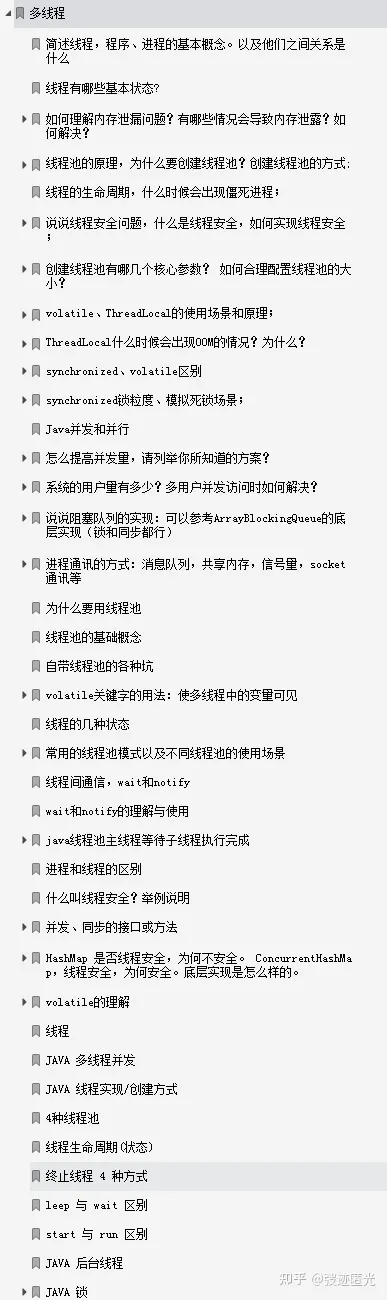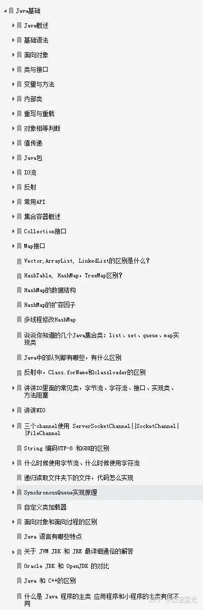 跳槽求职时时刻刻都在发生,但是我建议大家跳槽之前,先想清楚为什么要跳槽。切不可跟风,看到同事一个个都走了,自己也盲目的开始面试起来,期间也没有准备充分,到底是因为技术原因,影响自己的发展,偏移自己规划的轨迹,还是钱给少了,不受重视。准备不充分的面试,完全是浪费时间,更是对自己的不负责。今天给大家分享下整理的Java面试大纲,其中大部分都是面试过程中的面试题,可以对照这查漏补缺,当然了,这里所列的肯定不可能覆盖全部方式。希望能给大家提供一些帮助!