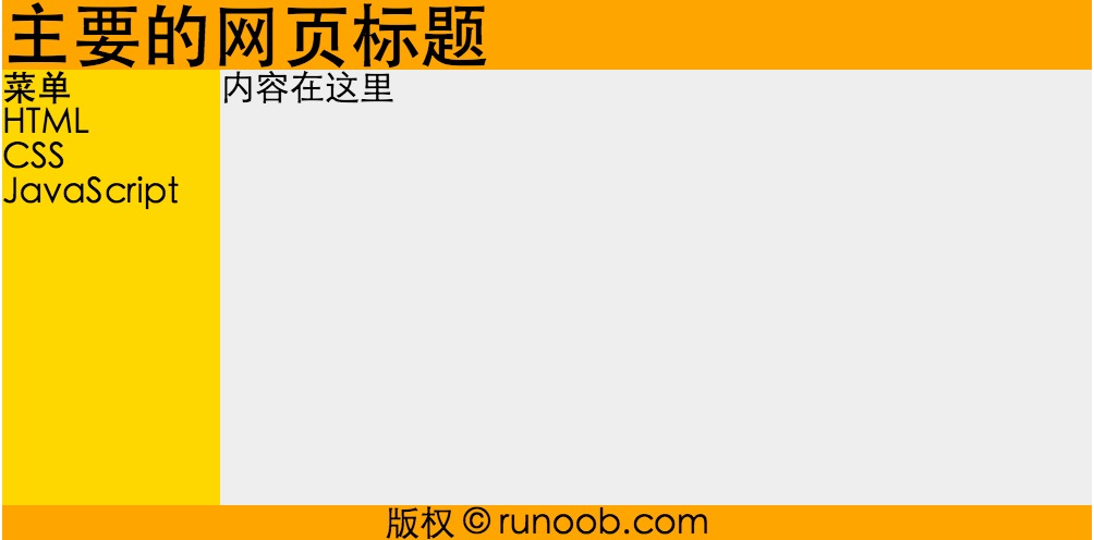 <!DOCTYPE html> <html> <head> <meta charset="utf-8"> <title>菜鸟教程(runoob.com)</title> </head> <body> <div id="container" style="width:500px"> <div id="header" style="background-color:#FFA500;"> <h1 style="margin-bottom:0;">主要的网页标题</h1></div> <div id="menu" style="background-color:#FFD700;height:200px;width:100px;float:left;"> <b>菜单</b><br> HTML<br> CSS<br> JavaScript</div> <div id="content" style="background-color:#EEEEEE;height:200px;width:400px;float:left;"> 内容在这里</div> <div id="footer" style="background-color:#FFA500;clear:both;text-align:center;"> 版权 © runoob.com</div> </div> </body> </html>