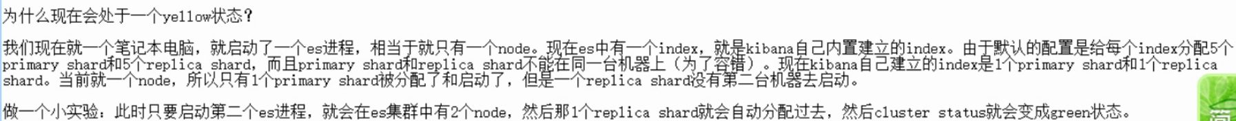 yellow:每个索引的primary shard都是active的,但是部分的replica shard不是active状态,出于不可用的状态