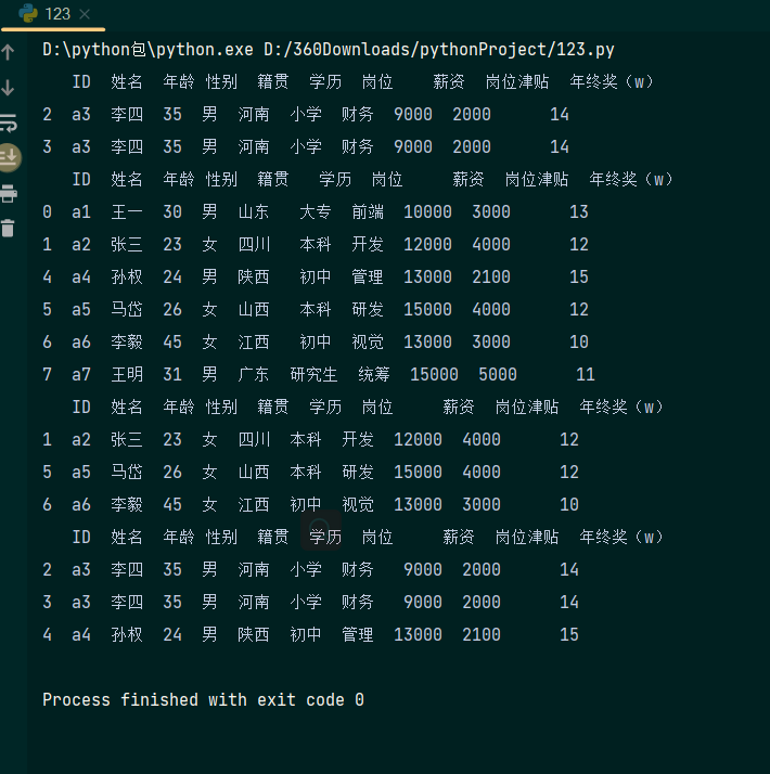d= data[(data['年终奖(w)']>13) | (data['籍贯']=='河南')]#筛选出数据表中年终奖>13的或者籍贯为河南的数据