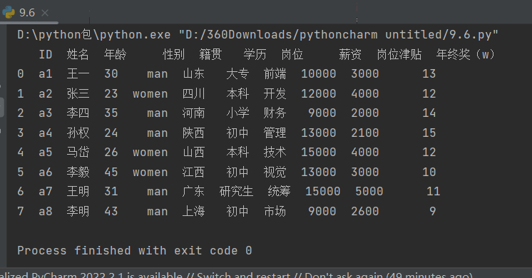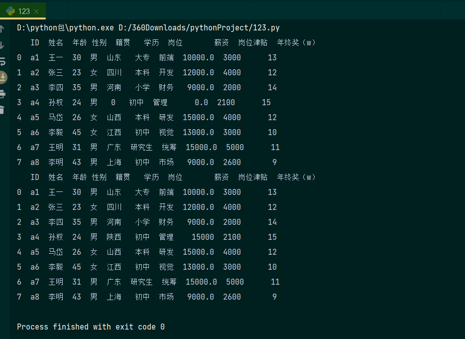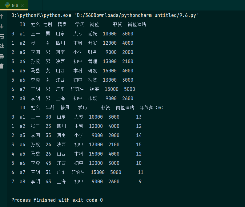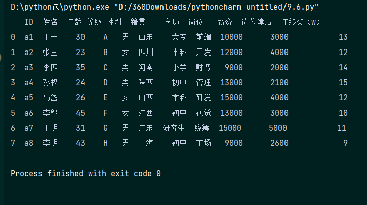 c=data.append(data1)#采用append()函数合并工作表,也可以用于在数据表的末尾追加数据,如:c=data.append({'ID':a9,’姓名‘:'张一'},ignore_index=True)结果在此就不一一演示,大家可以自己运行一下试试看。