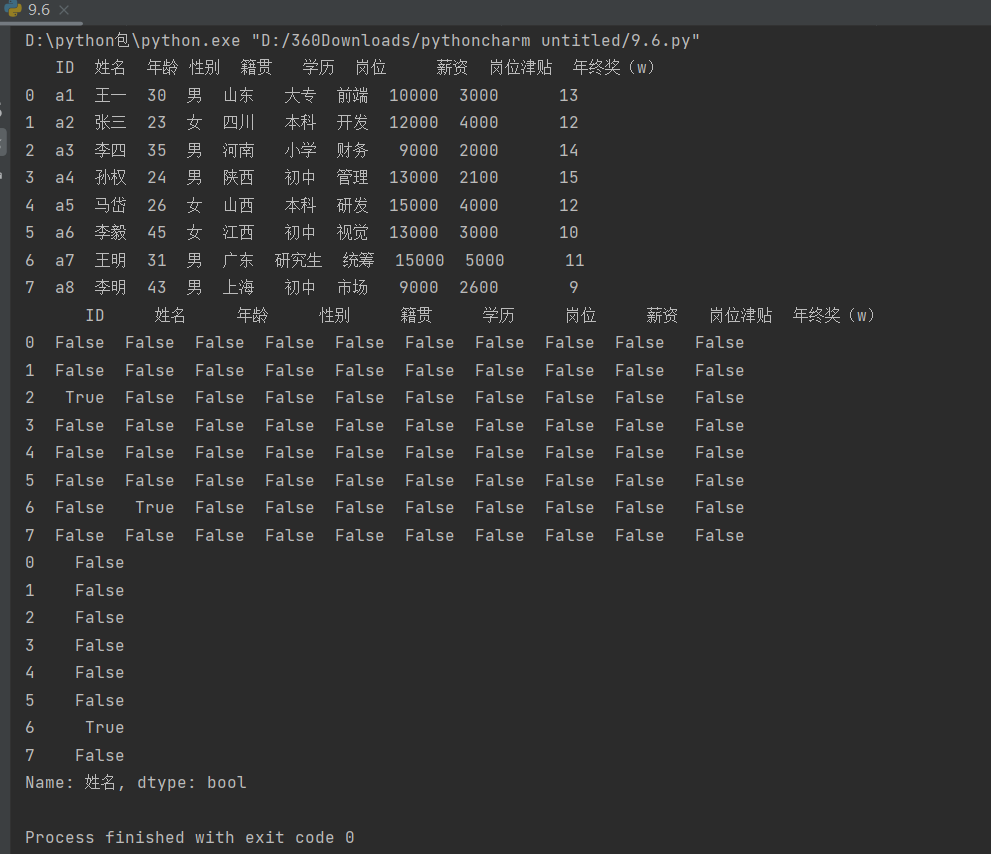 查找数据 使用模块中的isin()函数可以查看DataFrame是否包含某个值,演示代码如下: