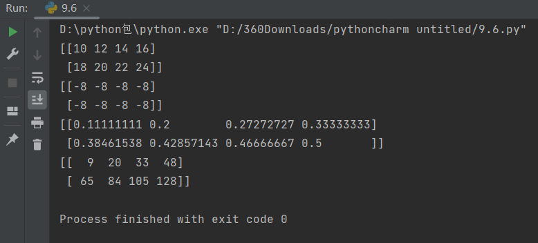对于多个形状一致的数组,我们可以进行加减乘除等运算,为了方便大家理解,代码演示如下: