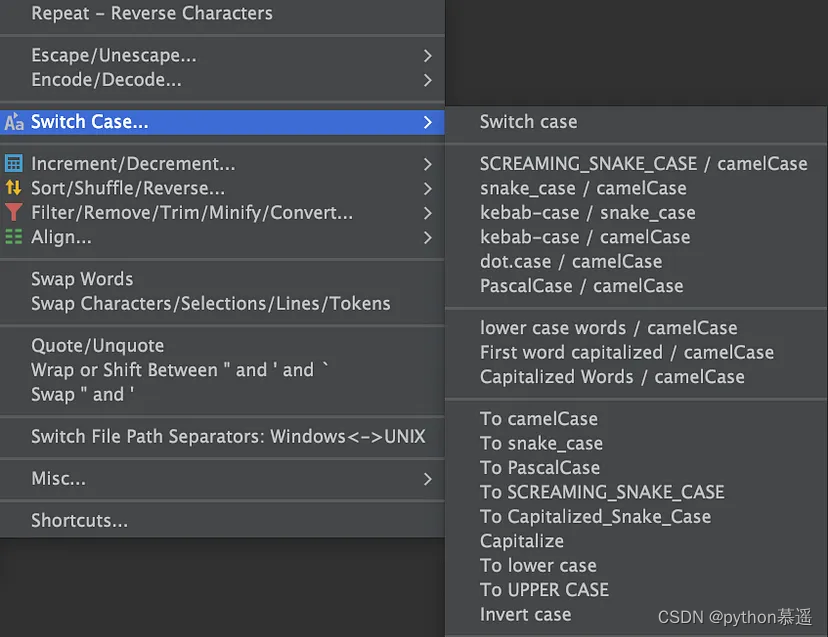 这个插件可以帮助大家在Pycharm中操作任何字符串,可以进行切换单词的大小写、反转字符、交换单词、编码/解码等操作。
