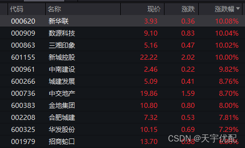 按照申万一级职业区分,房地产板块领涨,板块盘中涨幅超越4%,新华联、三湘形象、新城控股等股盘中冲击涨停。中南建设、中交地产、金地集团等股票也大幅上涨。