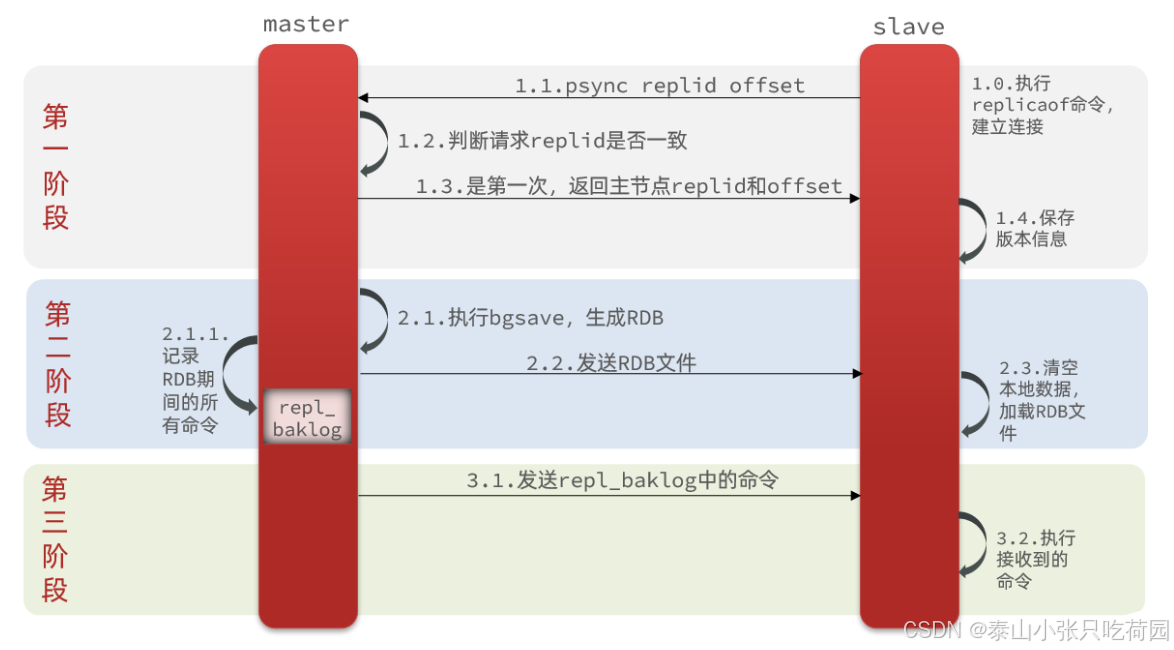 全量同步:master将完整内存数据生成RDB,发送RDB到slave。后续命令则记录在repl_baklog,逐个发送给slave。