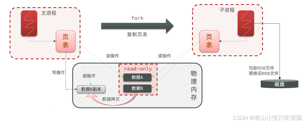 在主进程执行写操作时,物理内存会将数据拷贝一份作为副本给主进程写,写完之后再同步到子进程。