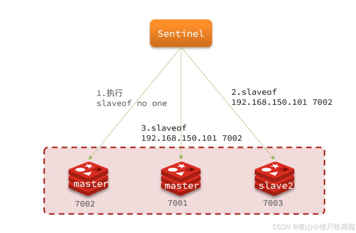 sentinel给所有其它slave发送slaveof 192.168.150.101 7002 命令,让这些slave成为新master的从节点,开始从新的master上同步数据。