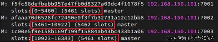 Redis会把每一个master节点映射到0~16383共16384个插槽(hash slot)上,查看集群信息时就能看到:
