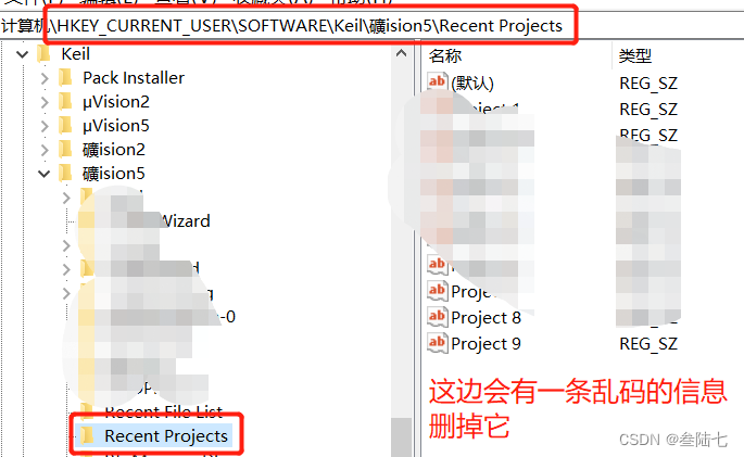 HKEY_CURRENT_USER → SOFTWARE → KEIL → 礦ision5 → RecentProject