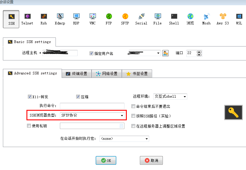 mobaxterm在ssh连接成功后,如果勾选了该选项,会尝试使用对应协议(上面是SFTP协议)在左侧列出目录文件信息,如果不支持sftp协议就会报错。因此选为None即可。