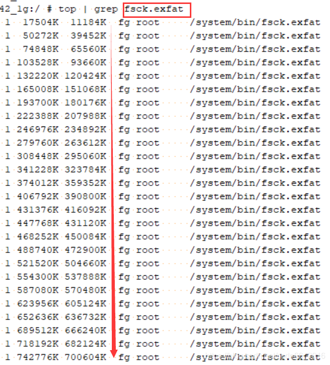 这里我们发现了fsck.exfat进程消耗了比较大的内存, 213754*4k(page size)= 834M, 我们是1G的内存