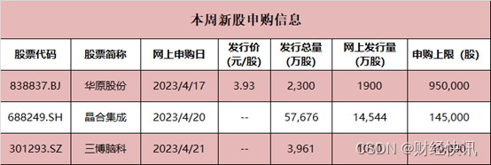 本周(4月17日—4月21日),截至现在,共有3只新股将进行申购,别离为科创板的晶合集成、创业板的三博脑科、北交所的华原股份。其间华原股份将于周一申购,发行价为3.93元/股,晶合集成将于周四申购,三博脑科将于周五申购。而今年以来最贵新股——索辰科技,将在下周二上市。
