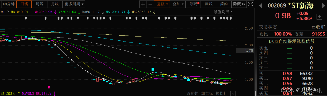 不过,*ST新海到4月14日,现已接连14个买卖收盘价低于1元,触及买卖类强制退市危险状况的概率不断提高。