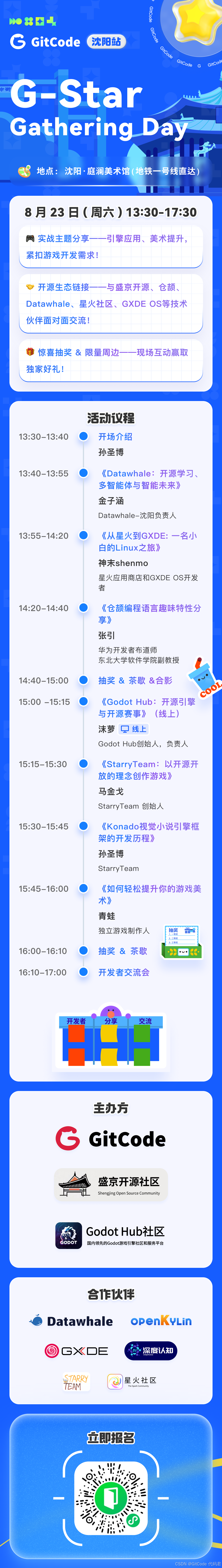 东北及周边的开发者注意啦!G-Star Gathering Day × 盛京开源社区× Godot Hub 联合主办的线下技术沙龙来啦!8月23日(周六),我们在 沈阳·庭澜美术馆 等你,一起探索游戏开发的无限可能!