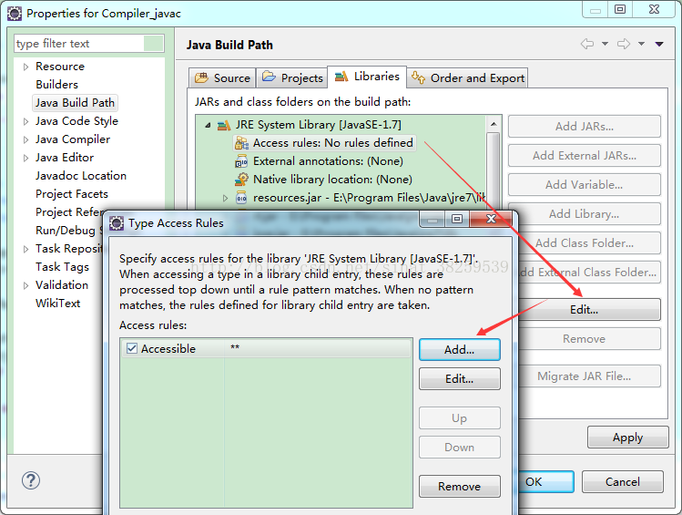 这是由于 Eclipse 的 JRE System Library 中默认包含了一系列的代码访问规则(Access Rules),如果代码中引用了这些访问规则所禁止引用的类,就会提示这个错误。可以通过添加一条允许访问 JAR 包中所有类的访问规则来解决这个问题,如图 10-3 所示。