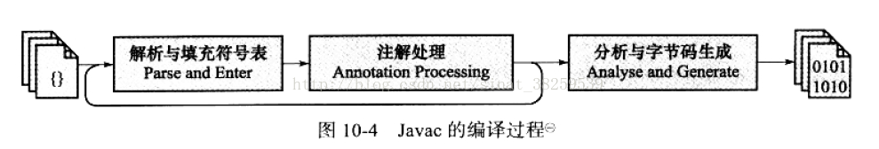 在 JDK 1.5 之后,Java 语言提供了对注解(Annotation)的支持,这些注解与普通 Java 代码一样,是在运行期间发挥作用的。在 JDK 1.6 中实现了 JSR-269 规范(JSR-269:Pluggable Annotations Processing API(插入式注解处理 API)),提供了一组插入式注解处理器的标准 API 在编译期间对注解进行处理,我们可以把它看做是一组编译器的插件,在这些插件里面,可以读取、修改、添加抽象语法树中的任意元素。如果这些插件在处理注解期间对语法树进行了修改,编译器将回到解析及填充符号表的过程重新处理,知道所有插入式注解处理器都没有再对语法树进行修改为止,每一次循环称为一个 Round,也就是图 10-4 中的回环过程。