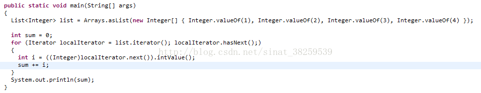 代码清单 10-6 中一共包含了泛型、自动装箱、自动拆箱、遍历循环与变长参数 5 种语法糖,代码清单 10-7 则展示了它们在编译后的变化。泛型就不必说了,自动装箱、拆箱在编译之后被转换成了对应的包装和还原方法,如本例中的 Integer.valueOf() 与 Integer.intValue() 方法,而遍历循环则把代码还原 成了迭代器的实现,这也是为何遍历循环需要被遍历的类实现Iterable 接口的原因。最后再看看变长参数,它在调用的时候变成了一个数组类型的参数,在变长参数出现之前,程序员就是使用数组来完成类似功能的。