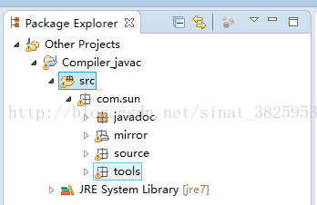 以 Eclipse IDE 环境为例,先建立一个名为 “Compiler_javac” 的 Java 工程,然后把 JDK_SRC_HOME/langtools/src/share/classes/com/sun/* 目录下的源文件全部复制到工程的源码目录中,(本人jdk源码openjdk\langtools\src\share\classes\com\sun\)如图 所示。
