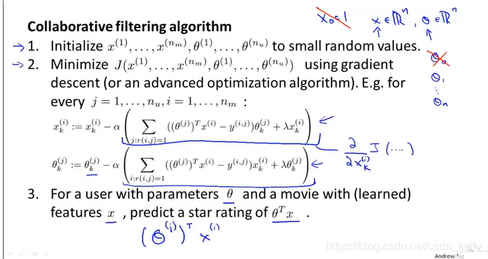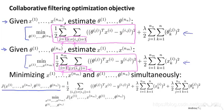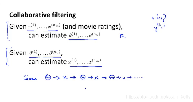 假设已知用户对电影的参数theta,求x_i,与前边讲述的刚好相反,我们就可以基于给定的theta 求出x,再根据求出的x推导出theta,如此循环,即可得出最好的效果。