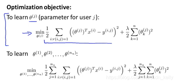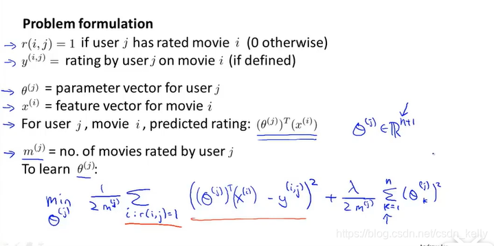 例子:n_u个用户,n_m个电影,基于电影的类型对每一部电影生成特征x,theta是用户的参数向量,用户j对某一部电影i的评分=,所以,为题由归结到了求参数theta,