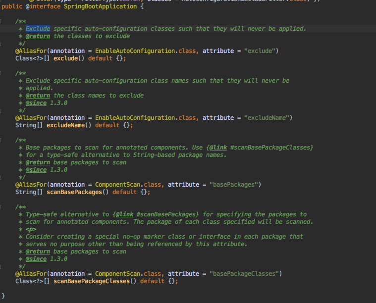 根据class name来排除,排除特定的类加入spring容器,传入参数value类型是class的全类名字符串数组。 - String[] scanBasePackages() default {}: