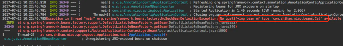 说明Cat类并没有纳入到spring容器中,这个结果也如我们所想,因为@SpringBootApplication只会扫描@SpringBootApplication注解标记类包下及其子包的类(特定注解标记,比如说@Controller,@Service,@Component,@Configuration和@Bean注解等等)纳入到spring容器,很显然MyConfig不在@SpringBootApplication注解标记类相同包下及其子包的类,所以需要我们去配置一下扫包路径。