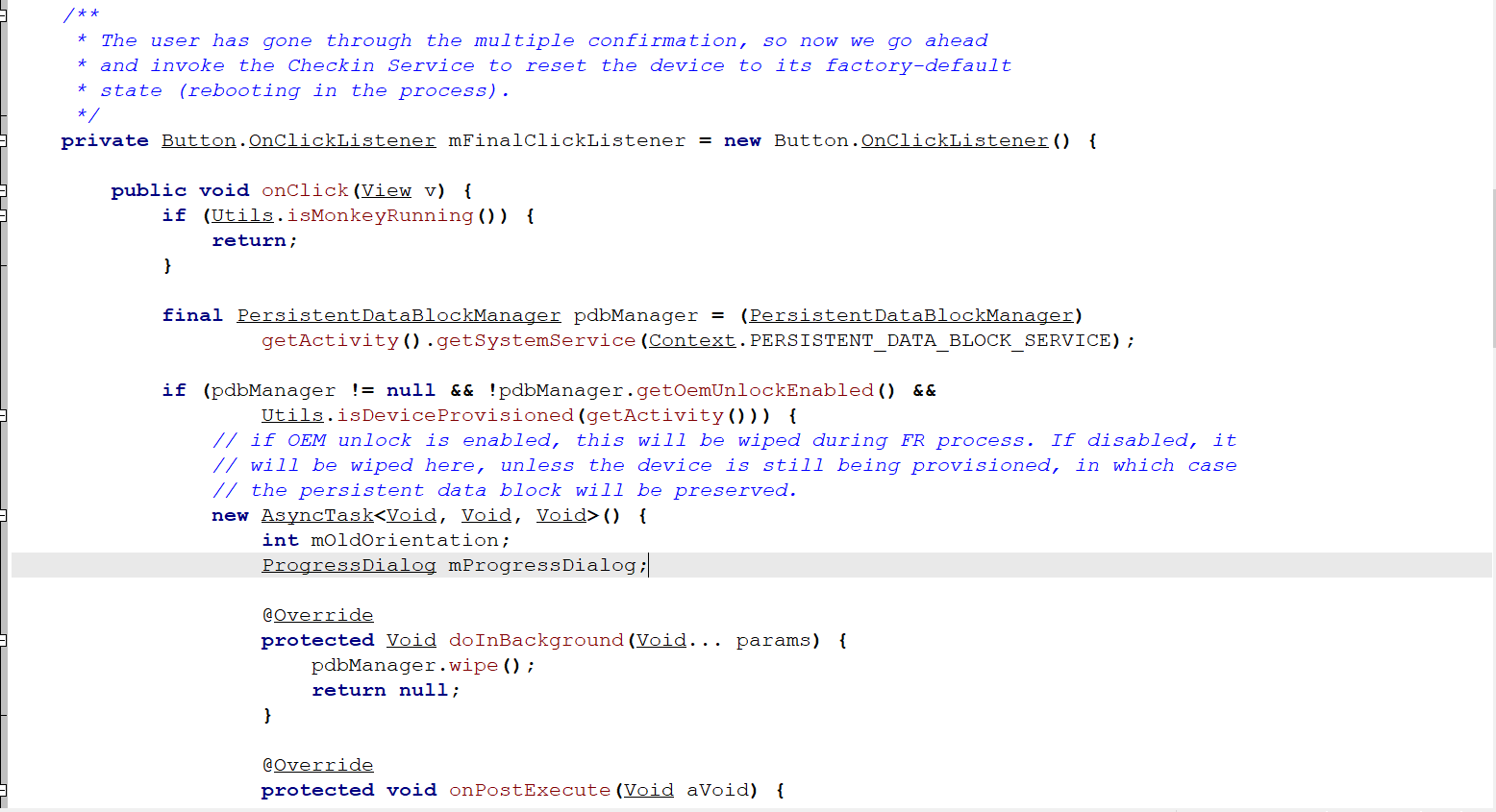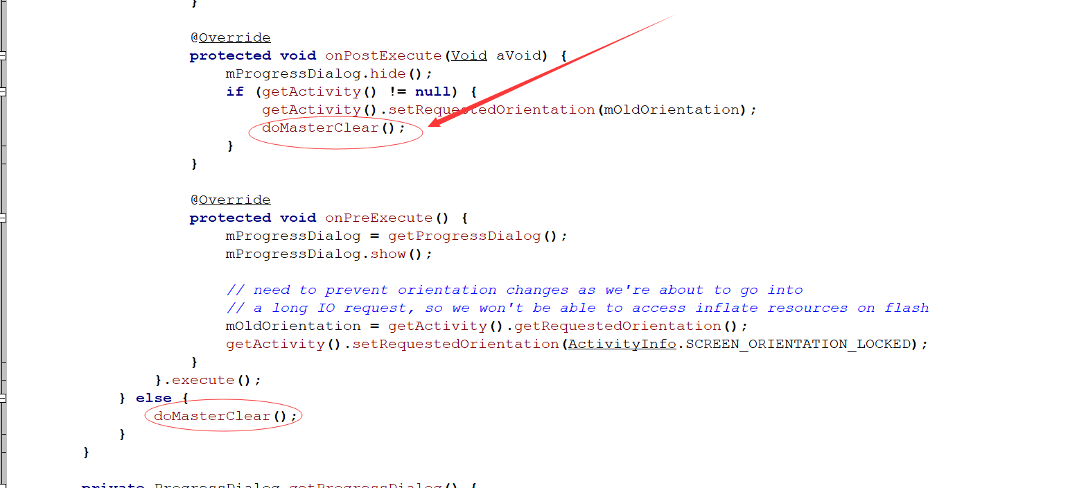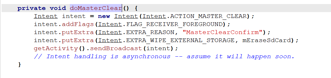 从代码可以看到此函数主要是发送广播,根据ACTION_MASTER_CLEAR查找是哪个java类广播接手处理这个广播,发现是MasterClearReceiver.java,接下来就是RecoverySystem.java类去调用方法rebootWipeUserData(context, shutdown, reason)