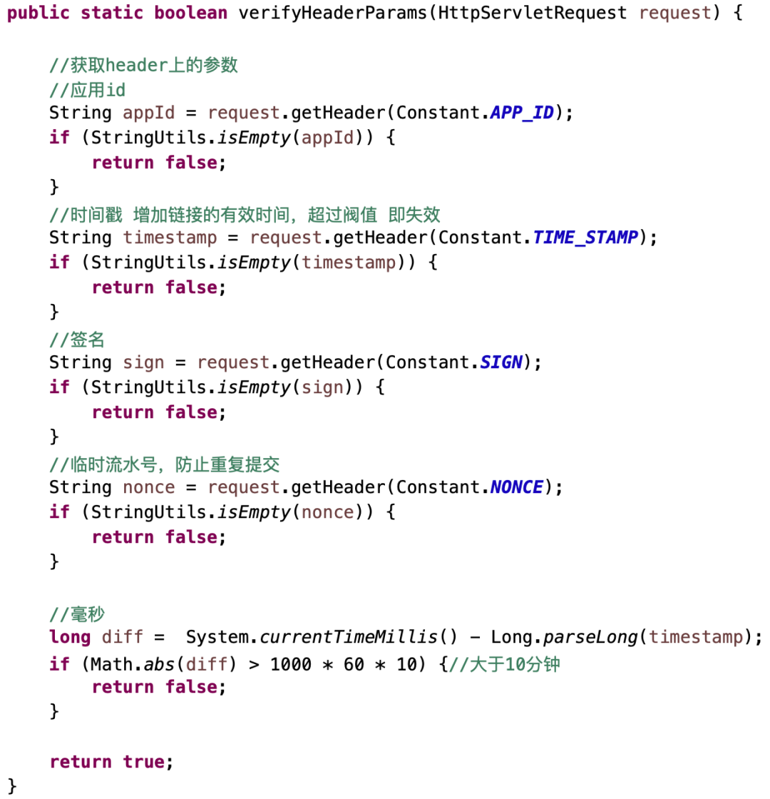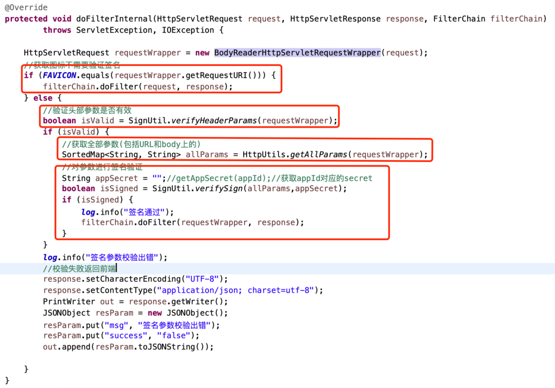 以上是filter类,其中有个appSecret需要自己业务去获取,它的作用主要是区分不同客户端app。并且利用获取到的appSecret参与到sign签名,保证了客户端的请求签名是由我们后台控制的,我们可以为不同的客户端颁发不同的appSecret。