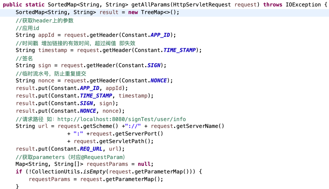 2)获取头部参数,request参数,Url请求路径,请求体Body,把这些值放入SortMap中进行排序