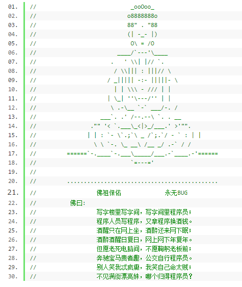 // _ooOoo_ // o8888888o // 88" . "88 // (| -_- |) // O\ = /O // ____/`---'\____ // . ' \\| |// `. // / \\||| : |||// \ // / _||||| -:- |||||- \ // | | \\\ - /// | | // | \_| ''\---/'' | | // \ .-\__ `-` ___/-. / // ___`. .' /--.--\ `. . __ // ."" '< `.___\_<|>_/___.' >'"". // | | : `- \`.;`\ _ /`;.`/ - ` : | | // \ \ `-. \_ __\ /__ _/ .-` / / // ======`-.____`-.___\_____/___.-`____.-'====== // `=---=' // // ............................................. // 佛祖保佑 永无BUG // 佛曰: // 写字楼里写字间,写字间里程序员;// 程序人员写程序,又拿程序换酒钱。// 酒醒只在网上坐,酒醉还来网下眠;// 酒醉酒醒日复日,网上网下年复年。// 但愿老死电脑间,不愿鞠躬老板前;// 奔驰宝马贵者趣,公交自行程序员。// 别人笑我忒疯癫,我笑自己命太贱;// 不见满街漂亮妹,哪个归得程序员? 问世间代码为何物