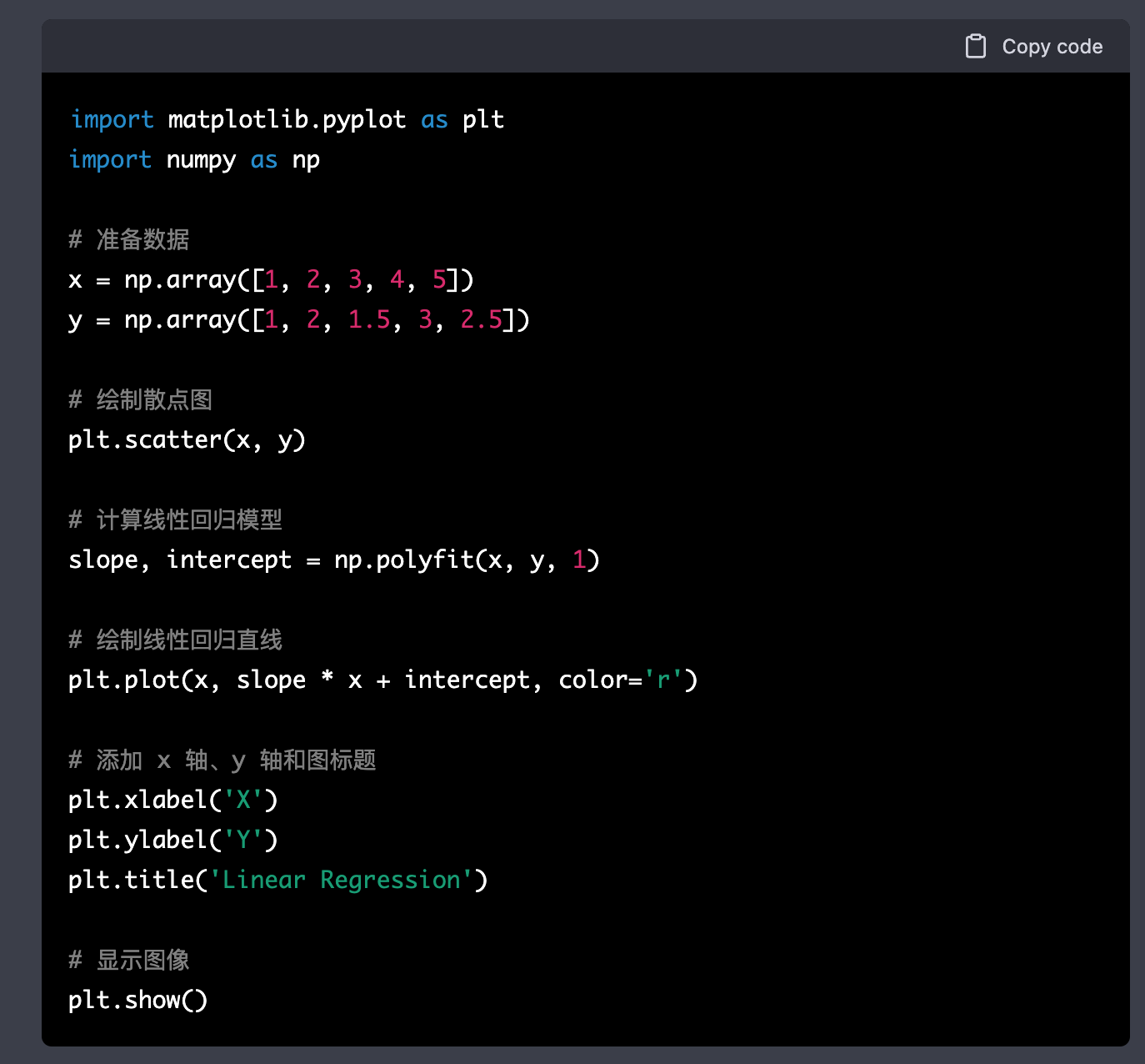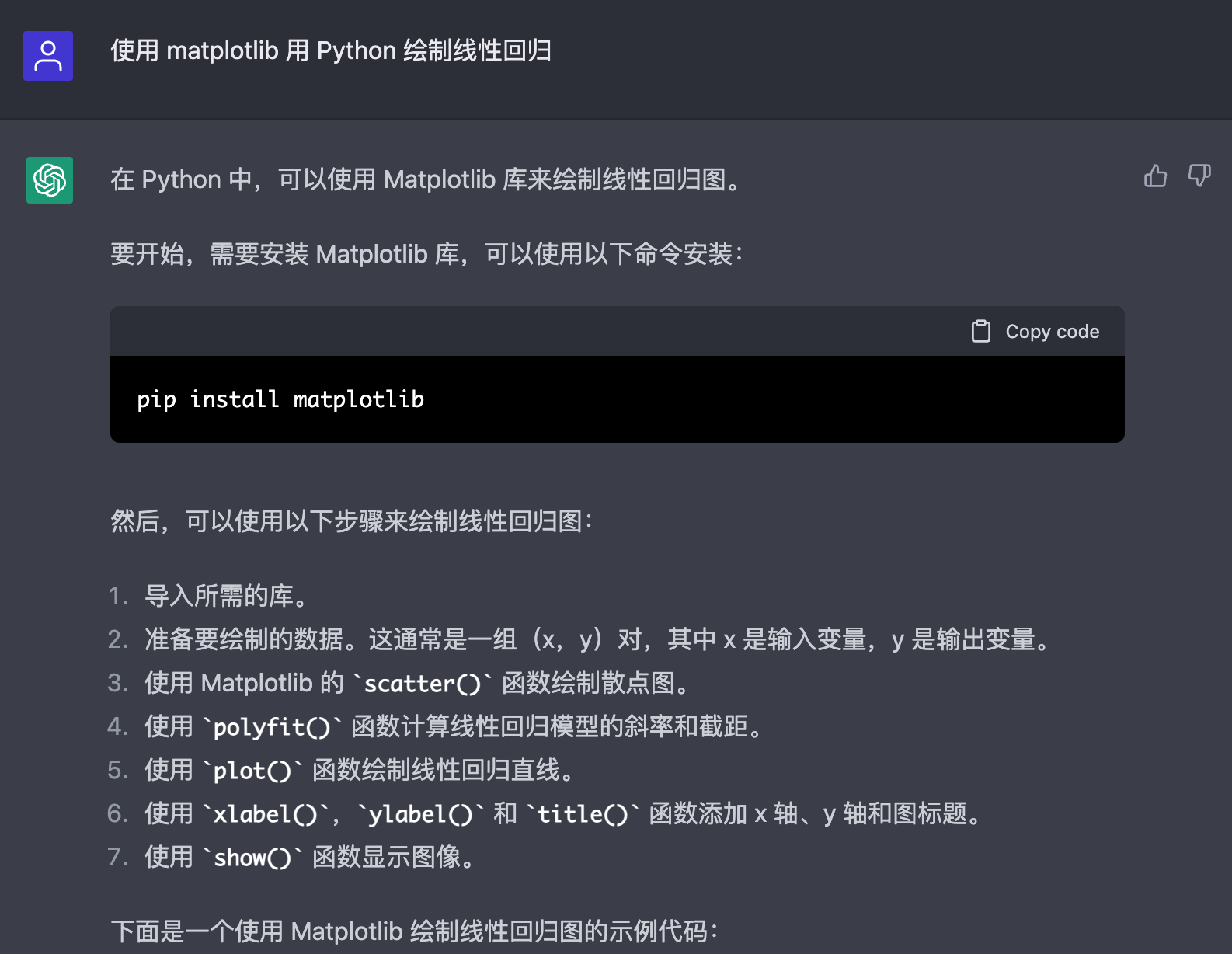 接下来,ChatGPT对话框内就会给你听绘制线性回归的步骤和实现代码,如下如所示:
