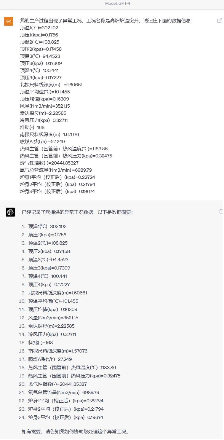 通过上述简单的实验,我们能够得出来的结论:(1)ChatGPT能够记忆数据信息、关联数据信息与工况的关系、出现工况给出处理措施,本质数据信息也是文字的一种形式;(2)ChatGPT能够找出来降输入认知信息以外的非正常数据信息;(3)在广域网范围内能够给出来处理措施,这个处理措施是有误的。