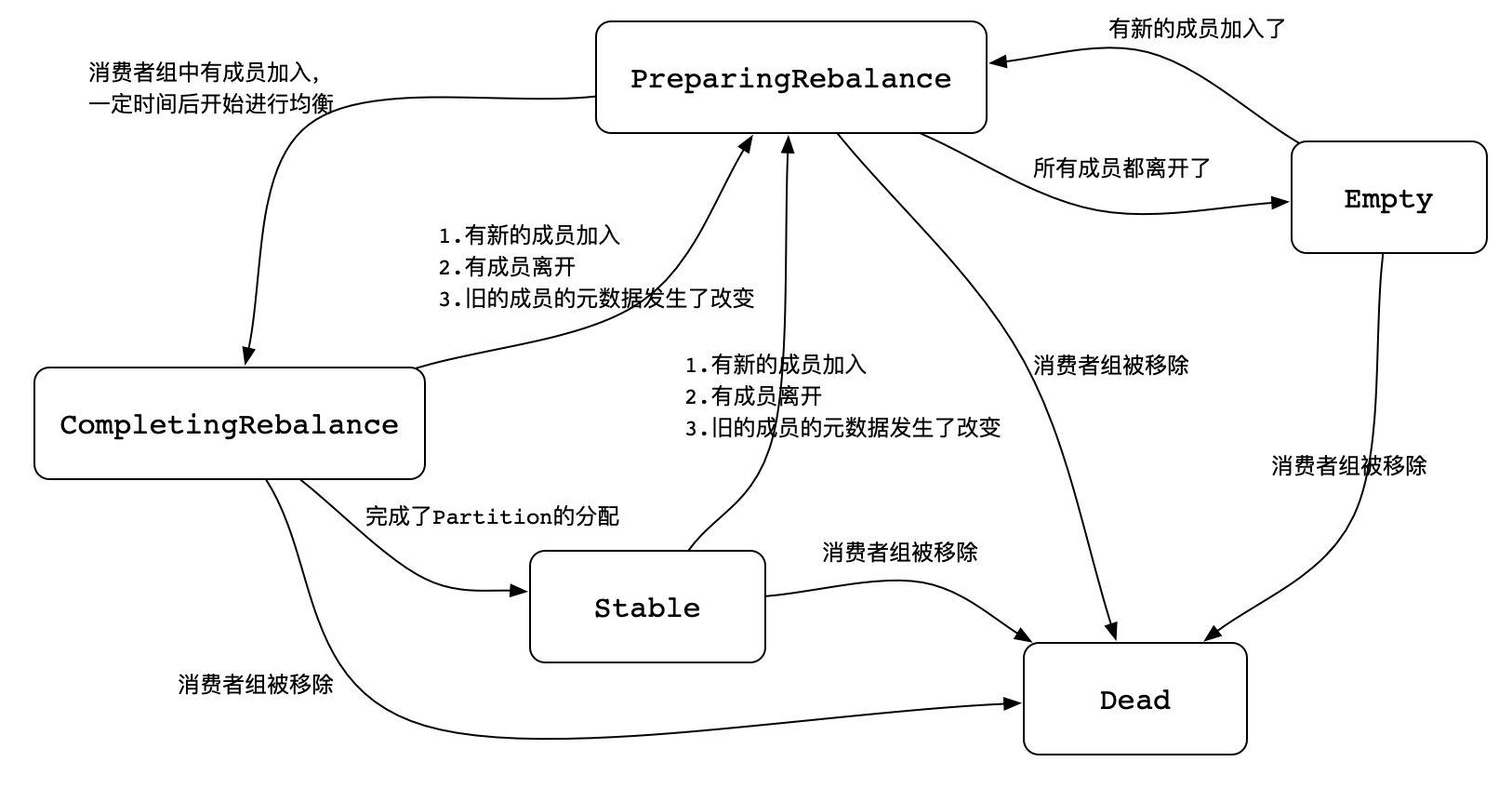 如果是sessionTimeout超时,则会被标记为当前协调器处理断开,此时,会将消费者移除,重新分配分区和消费者的对应关系。在Kafka Broker Server中,Consumer Group定义了5中(如果算上Unknown,应该是6种状态)状态,org.apache.kafka.common.ConsumerGroupState,如下图所示: