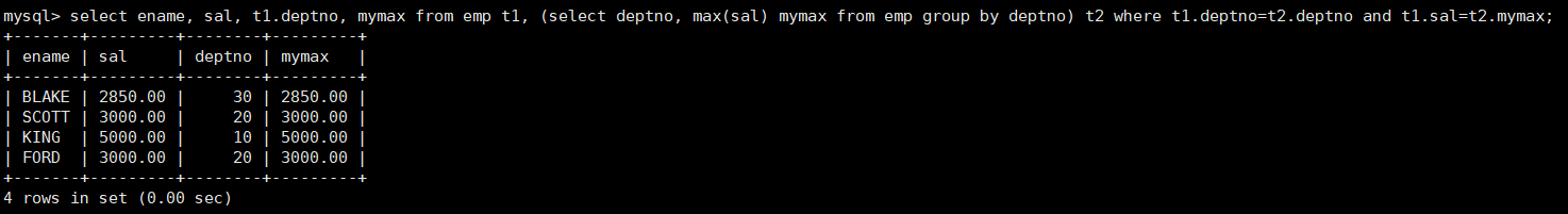 示例3: 查找每个部门工资最高的人的姓名、工资、部门、最高工资。